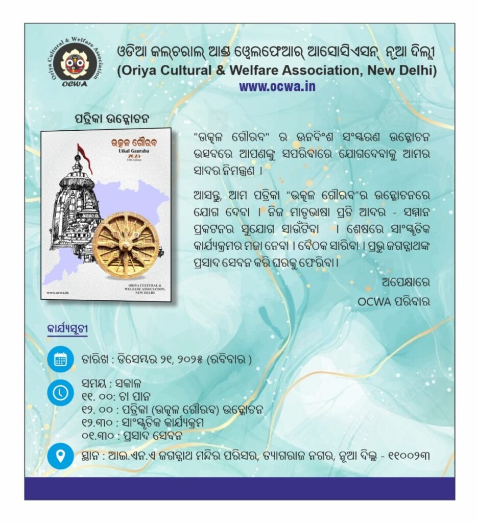 ତାରିଖ : ଡିସେମ୍ବର ୨୧, ୨୦୨୫ (ରବିବାର ), ସମୟ : ସକାଳ ୧୧. ୦୦ : ଚା ପାନ, ୧୨. ୦୦ : ପତ୍ରିକା ଉନ୍ମୋଚନ, ୧୨.୩୦ : ସାଂସ୍କୃତିକ କାର୍ଯ୍ୟକ୍ରମ, ୦୧.୩୦ : ପ୍ରସାଦ ସେବନ I ସ୍ଥାନ : ଆଇ.ଏନ.ଏ ଜଗନ୍ନାଥ ମନ୍ଦିର ପରିସର, ତ୍ୟାଗରାଜ ନଗର, ନୂଆ ଦିଲ୍ଲୀ